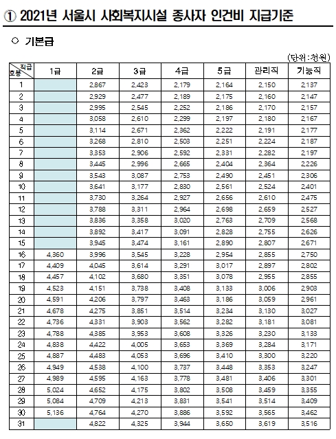 서울시 2021년 사회복지시설 종사자 처우 개선 및 운영계획 인건비 지급기준 본문