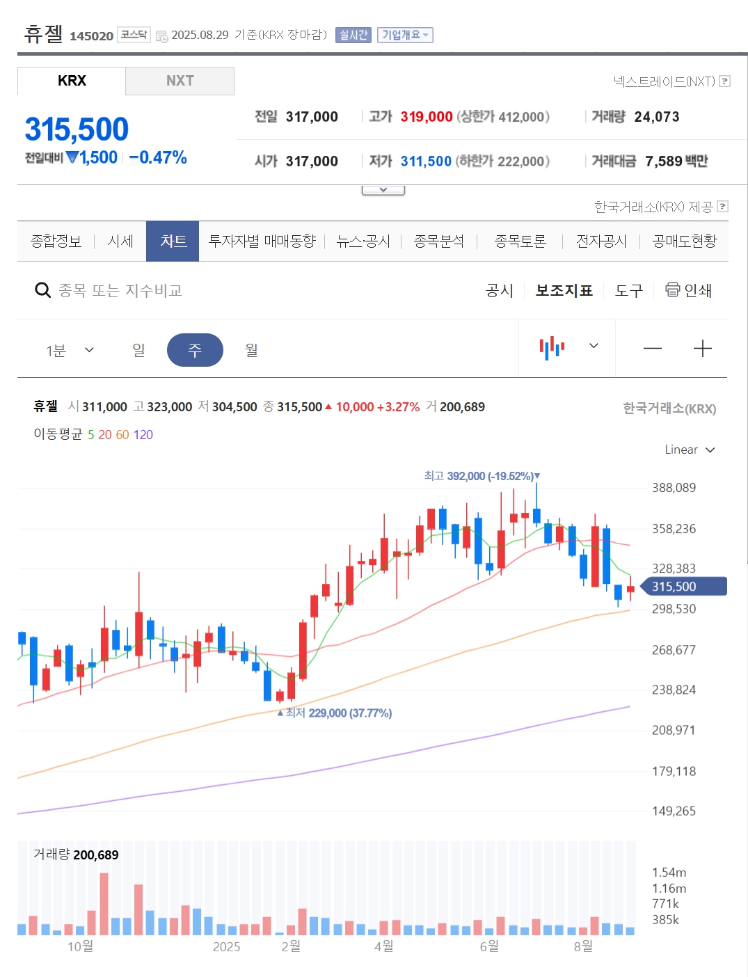 휴젤의 2025년 8월 30일 기준 현재 주가는 315,500원으로, 52주 최고가 388,000원(2025년 7월 1일) 대비 18.7% 하락한 수준에서 거래되고 있습니다. 시가총액은 약 3.88조원으로 코스닥 시장에서 9위를 차지하고 있으며, 발행주식수는 1,230만주입니다.[3][4]